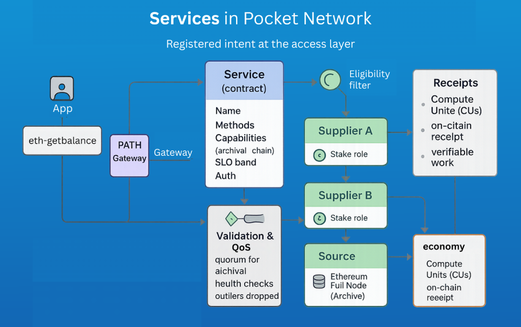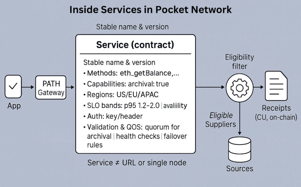 When you hear “Service” in relation to Pocket Network, think of it as a public broadcast that tells the network what kind of data an application wants, how it should be delivered, and what quality bar it must meet. This is done via a named contract, at the access layer – NOT via a server.