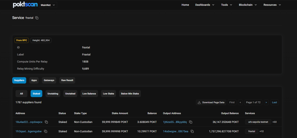 List of Suppliers for the Fraxal data Service on Pocket Network. Source: POKTScan
