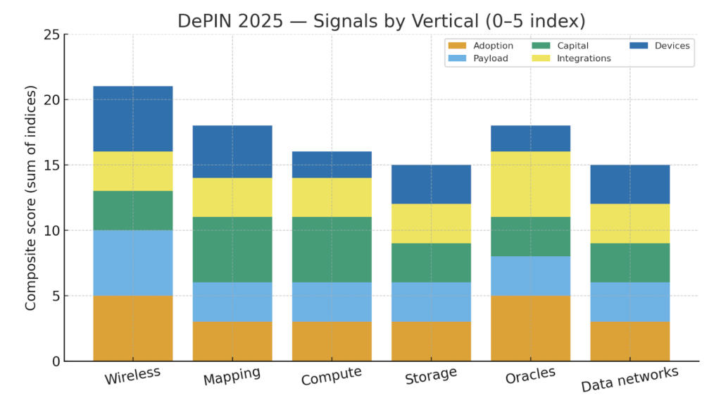 Methodology: This chart compares the overall strength of each DePIN vertical in 2025 by summing five 0–5 scores across five categories (adoption, etc). The scores are a directional editorial composite drawn from public 2025 signals and reports (such as Messari research, CoinGecko category snapshots, etc., and project updates from Helium, Akash, etc).